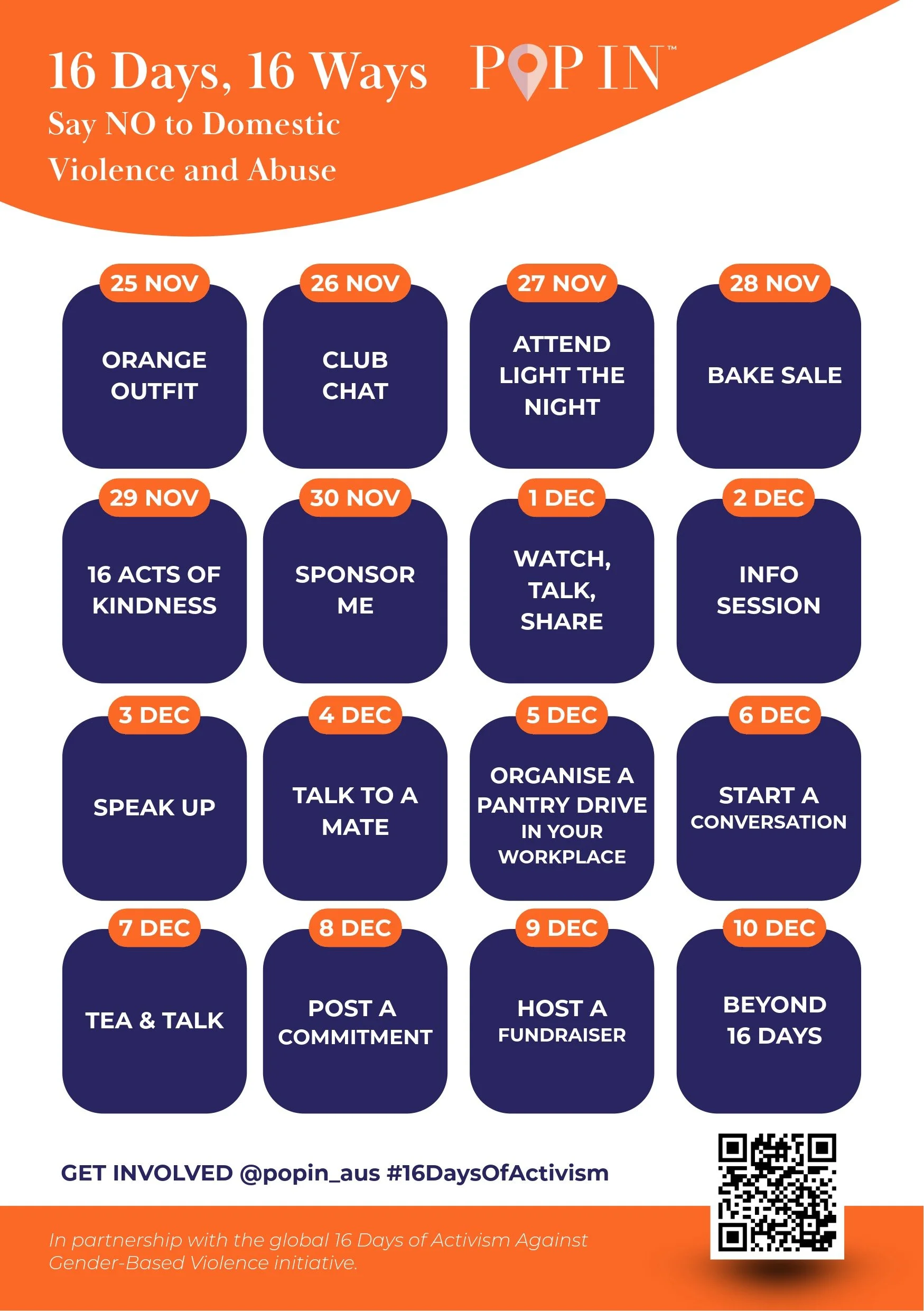 From 25 November to 10 December, Pop In will be posting daily on our Instagram feeds 16 simple, meaningful ways you can get involved. Each action is designed to raise awareness and build a culture of safety and respect for women and children.
