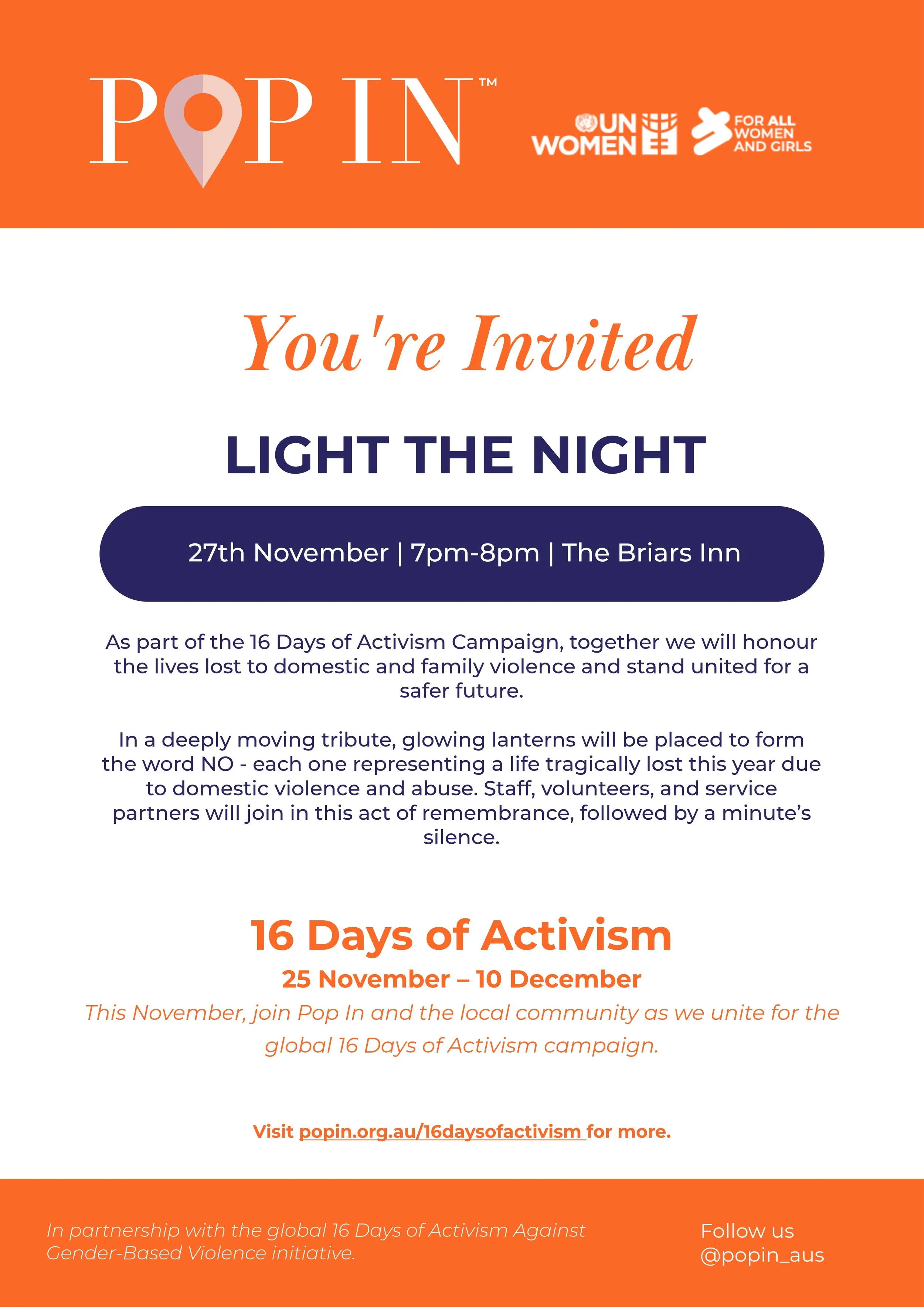 As part of the 16 Days of Activism campaign, Pop In has also been invited to stand among 28 domestic and family violence organisations working together to demand change.